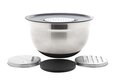 - Bijzonderheden: Kom met deksels met 3 verschillende raspen om groente te raspen wat direct wordt opgevangen in de kom.